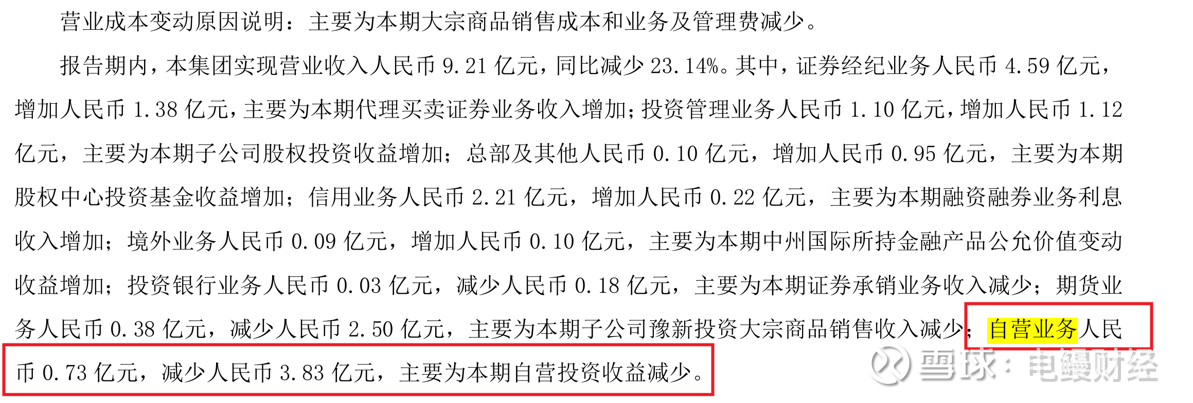 财报显示,其中,证券经纪业务4.59亿元,增加1.38亿元,主要为本期代理买卖证券业务收入增加;投资管理业务1.10亿元,增加1.12亿元,主要为本期子公司股权投资收益增加;总部及其他0.10亿元,增加0.95亿元,主要为本期股权中心投资基金收益增加;信用业务2.21亿元,增加0.22亿元,主要为本期融资融券业务利息收入增加;境外业务0.09亿元,增加0.10亿元,主要为本期中州国际所持金融产品公允价值变动收益增加;投资银行业务0.03亿元,减少0.18亿元,主要为本期证券承销业务收入减少;期货业务0.38亿元,减少2.50亿元,主要为本期子公司豫新投资大宗商品销售收入减少;自营业务0.73亿元,减少3.83亿元,主要为本期自营投资收益减少。