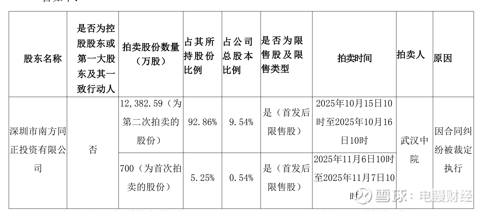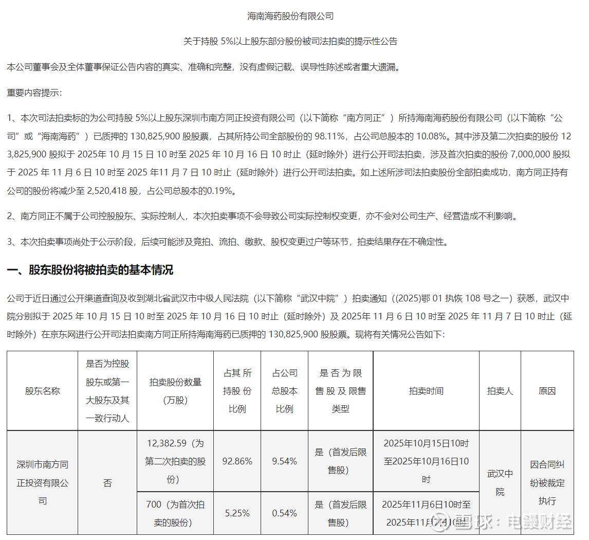 根据公告,此次司法拍卖标的为公司持股 5%以上股东南方同正所持海南海药已质押的 1.31亿股股票,占其所持公司全部股份的98.11%,占公司总股本的 10.08%。其中涉及第二次拍卖的股份1.24亿股拟于2025年 10 月 15 日 10 时至 2025 年 10 月 16 日 10 时止(延时除外)进行公开司法拍卖,涉及首次拍卖的股份 700万股拟于 2025 年 11 月6 日10 时至2025年11 月 7 日 10 时止(延时除外)进行公开司法拍卖。如上述所涉司法拍卖股份全部拍卖成功,南方同正持有公司的股份将减少至 252.04万股,占公司总股本的0.19%。