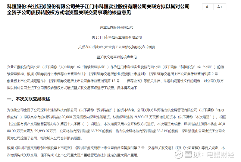 近期,科恒股份发布公告,公司关联方珠海格力供应链管理有限公司(以下称格力供应链)拟以其对科恒股份全资子公司深圳市浩能科技有限公司(以下称浩能科技)享有的2亿元债权进行增资,认购深圳浩能1.99亿元新增注册资本。根据《企业国有资产交易监督管理办法》第四十六条第(二)项规定,此次增资采用非公开协议方式进行。此次增资完成后,深圳浩能注册资本将由 4亿元变更为5.99亿元,公司将持有深圳浩能 66.79%的股份,格力供应链将持有深圳浩能33.21%的股份,深圳浩能由公司全资子公司变更为公司控股子公司,继续纳入公司合并报表范围。