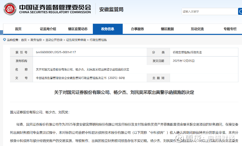 12月5日,安徽证监局发布关于对国元证券、杨少杰、刘民昊采取出具警示函措施的决定,经查,国元证券股份有限公司作为2025年度安徽富煌钢构股份有限公司发行股份及支付现金购买资产并募集配套资金暨关联交易项目的财务顾问,在接受委托出具财务顾问专业意见过程中,未对标的公司合肥中科君达视界技术股份有限公司(以下简称“中科视界”)收入确认跨期问题保持充分的职业审慎、未充分核查中科视界与部分经销类客户的交易实质,导致制作、出具的独立财务顾问报告存在不实记载。杨少杰、刘民昊作为项目主办人,对以上违规行为负有主要责任。
