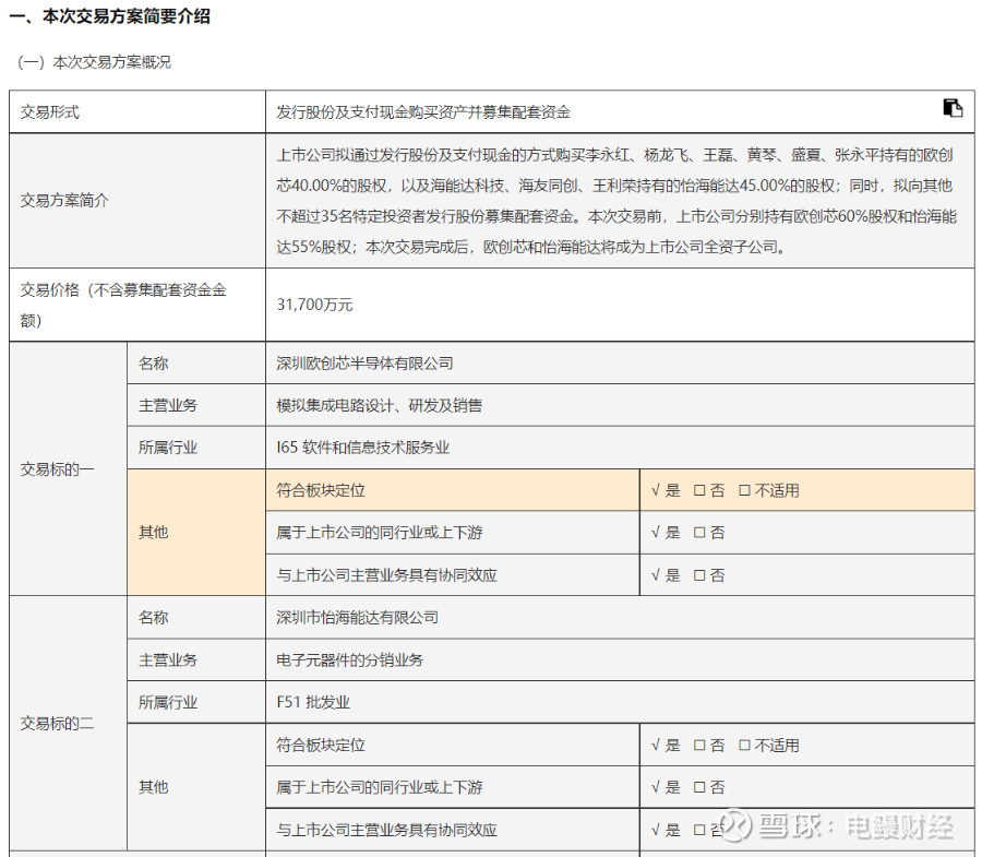 在资本市场的并购浪潮中,雅创电子近期的收购引发广泛关注。 2026年1月1日,雅创电子发布《发行股份及支付现金购买资产并募集配套资金报告书(草案)》公告。根据草案显示,雅创电子拟通过发行股份及支付现金的方式购买李永红、杨龙飞、王磊、黄琴、盛夏、张永平持有的欧创芯40.00%的股权,以及海能达(12.020, 0.00, 0.00%)科技、海友同创、王利荣持有的怡海能达45.00%的股权;同时,拟向其他不超过35名特定投资者发行股份募集配套资金。