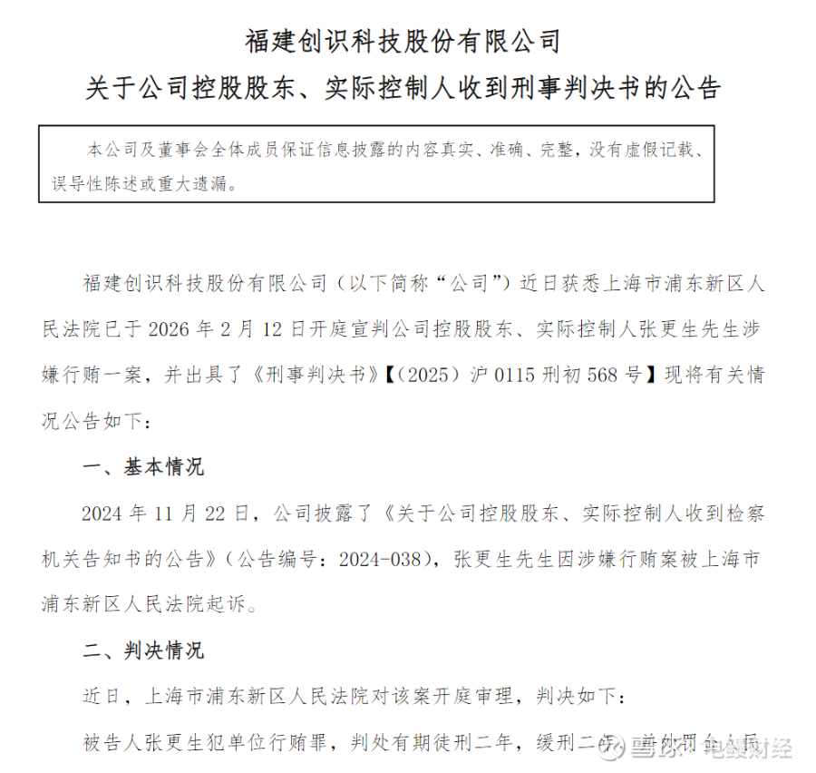 2月13日,创识科技发布公告披露,近日获悉上海市浦东新区人民法院已于2月12日开庭宣判公司控股股东、实际控制人张更生涉嫌行贿一案,并出具了《刑事判决书》。