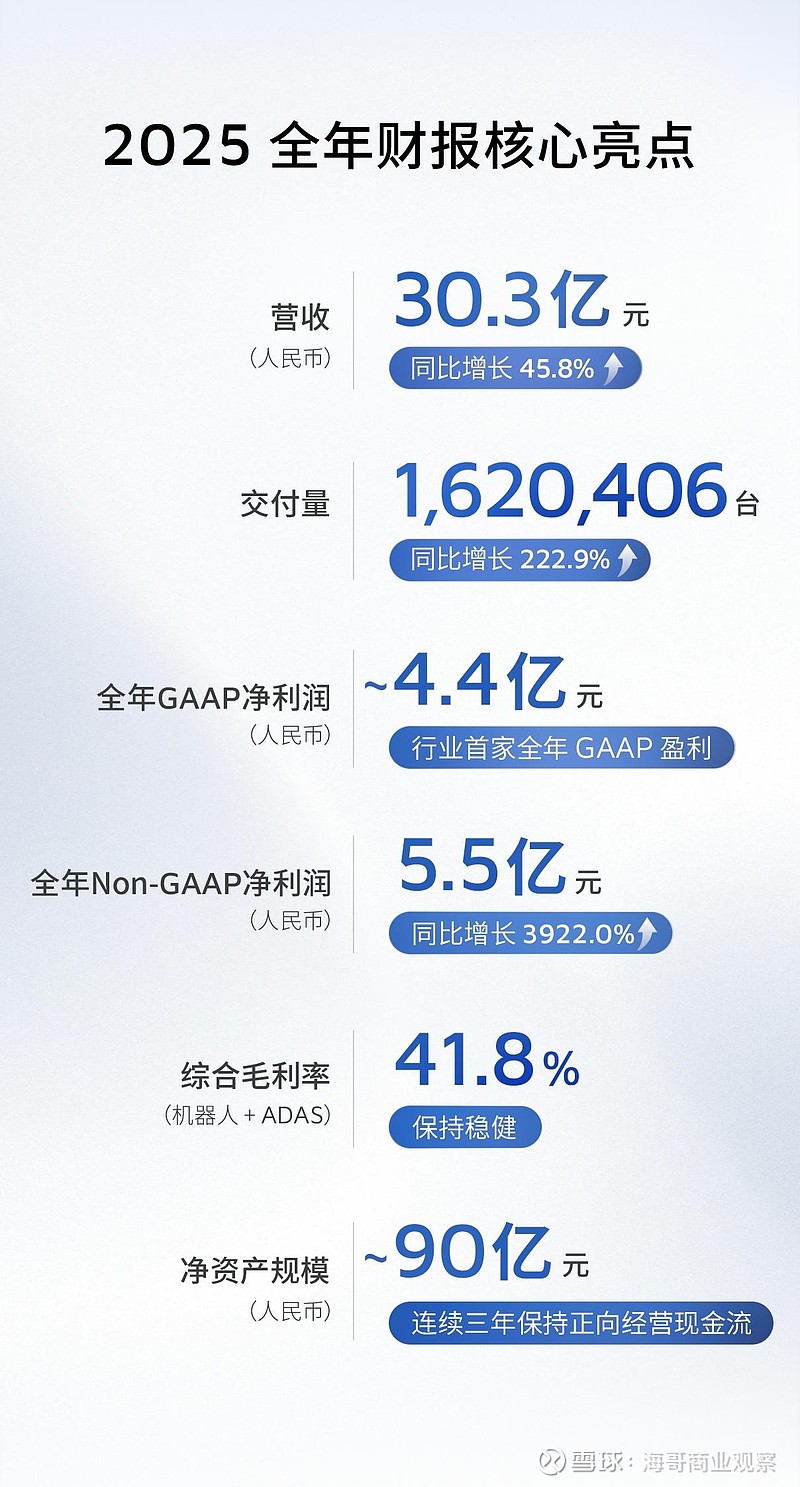 30.3亿营收、4.4亿净利润、160万台交付量、超40%市占率、425.8%的机器人业务增长、英伟达平台独家合作、1000万颗机器人订单——这些数据拼在一起,已经不是“利好”两个字能概括的了,这是对整个行业商业模式的一次确认。