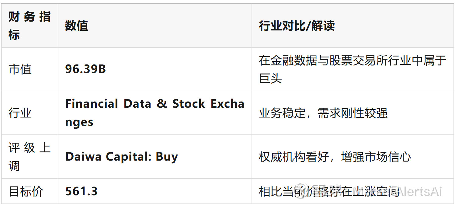 投资洞察:Daiwa Capital将Moody's评级从持有上调至买入,目标价提升至561.3美元,反映出分析师对其未来增长前景的乐观态度。在经济不确定性和市场波动加剧的背景下,市场对信用评级和风险分析工具的需求可能增加,这有利于Moody's的核心业务。分析师的积极评价进一步确认了公司的价值和增长潜力。