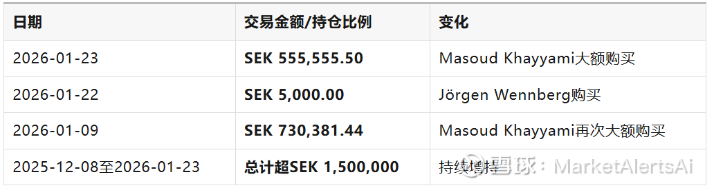 投资洞察:多名高管在3个月内持续买入公司股票,特别是Masoud Khayyami累计购买超过SEK 1,500,000,这种集群式增持非常罕见。内部人士最了解公司的真实情况,他们的行为往往反映了对公司前景的乐观态度。当多个高管同时增持时,这种信号更加可信,因为他们各自独立地做出了相同的判断。