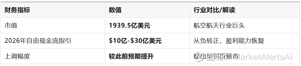 投资洞察:波音上调2026年自由现金流指引至正10亿-30亿美元,这是一个令人惊喜的转变。此前公司因737 MAX问题和供应链挑战导致现金流持续为负,此次上调表明其商业飞机交付量提升以及防务和全球服务部门表现改善。尽管Spirit收购带来10亿美元负面影响,但公司仍能实现现金流由负转正,显示其盈利能力正在恢复。