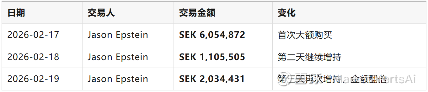 投资洞察:这是今天最震撼的内部交易信号——Jason Epstein 在 3 个交易日内连续 3 次增持,总金额超过 900 万瑞典克朗(约合 85 万美元)。这种密集、大额的连续买入行为极为罕见,通常表明内部人士认为股价严重低估,或者有重大利好消息即将公布。考虑到游戏行业的高波动性,这种级别的内部人信心值得投资者高度关注。