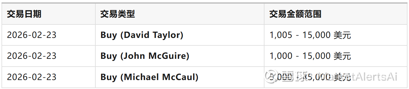 投资洞察:这个信号最有趣的地方在于,三位政客同时买入,形成了罕见的"集群信号"。David Taylor、John McGuire 和 Michael McCaul 共进行了 5 次买入交易,总金额在 5,005 至 75,000 美元之间。政客群体性买入往往意味着他们对某个行业或公司有超越常人的信息优势。