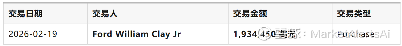 投资洞察:这个信号简单粗暴——William Clay Ford Jr(福特家族成员)在 2026 年 2 月 19 日单笔买入 193 万美元。这是典型的"PowerBuy"信号,金额远超 10 万美元门槛。内部人士尤其是创始家族成员的大额买入,往往是最强烈的信心信号。