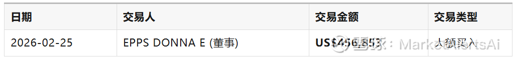 投资洞察:这个信号最有趣的地方在于,董事 EPPS DONNA E 在 2026 年 2 月 25 日直接掏出 45.6 万美元真金白银买入公司股票。内部人士用自己的钱投票,往往比任何分析师报告都更有说服力——毕竟,没有人比公司高管更了解公司的真实状况。