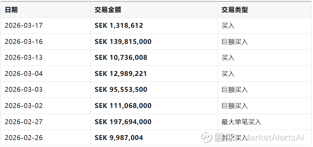 投资洞察:最引人注目的是,董事会副主席 Marcus Wallenberg 在 2026 年 2 月 26 日至 3 月 17 日的短短 6 个交易日内,连续 8 次大额增持,累计金额超过 6.7 亿瑞典克朗(约合 6400 万美元)。这种密集且大额的增持模式极为罕见,尤其是来自公司最高层管理人员的持续买入,通常意味着内部人士对公司未来价值释放具有极强信心。