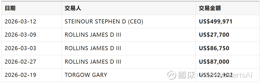 投资洞察:该信号最显著的特征是"集群效应"——在 2026 年 2 月 19 日至 3 月 12 日的三周内,至少 3 位不同的内部人士(包括 CEO STEINOUR STEPHEN D 和董事 ROLLINS JAMES D III)进行了 9 次买入操作。这种多人同时买入的模式比单一内部人士增持更具说服力,表明公司管理层对未来业绩改善存在共识。