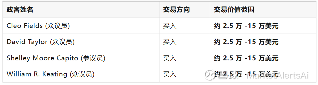 投资洞察:该信号的独特之处在于"政客集群"——4 位不同政客(Cleo Fields、David Taylor、Shelley Moore Capito、William R. Keating)在相近时期内买入 GOOGL 股票,合计交易价值在 10.3 万至 29.5 万美元之间。虽然政客交易的报告可能存在 45 天延迟且金额为区间值,但这种跨党派的集体买入行为仍然值得投资者关注,可能反映了对科技巨头长期价值的共识。