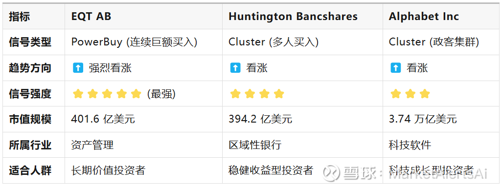 历史经验:内部人士连续大额增持(尤其是 PowerBuy 信号)往往领先股价上涨 3-6 个月,而集群信号(Cluster)的准确率通常超过 65%。