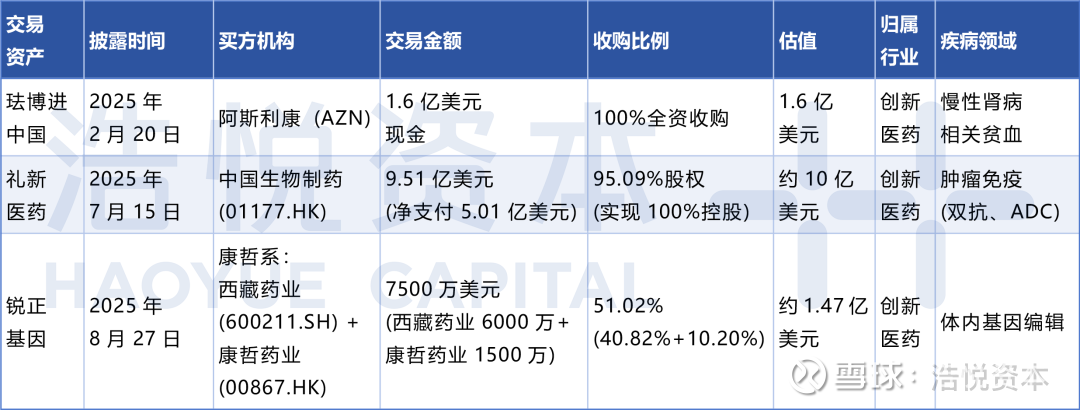 创新升级需求:中国生物制药收购礼新/ 赫吉亚,核心瞄准其在肿瘤靶向药/核酸创新药领域的优质创新管线,弥补自身“从临床到商业化” 的短板;康哲系收购锐正,聚焦体内基因编辑技术平台,实现“仿创结合” 向 “自主创新” 的转型。