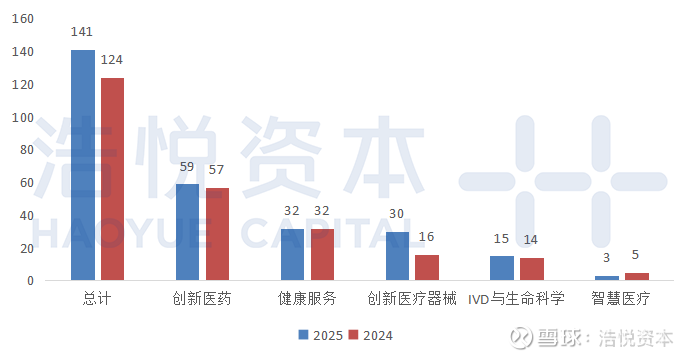据浩悦资本统计,2025年整体医疗领域并购交易数量达141笔,相较于2024年的124笔实现稳步增长;细分领域中,创新医疗器械类交易成为最大增长点,从2024年的16笔激增至30笔,实现近一倍增长,创新医药、健康服务类交易数量与2024年持平,IVD与生命科学类小幅增长,智慧医疗类略有回落,各细分赛道并购节奏与产业发展需求高度匹配。