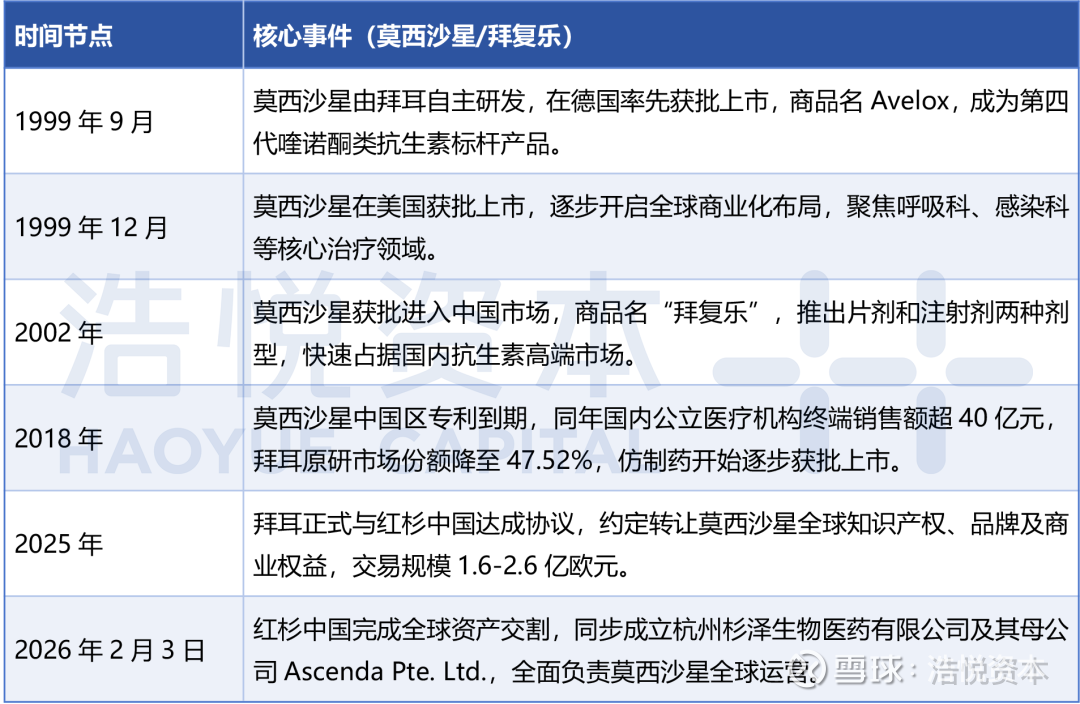 交易体现了跨国药企将过期“重磅炸弹”药物资产货币化的普遍策略,同时也显示了中国资本(如红杉中国)对具有全球品牌价值成熟产品的兴趣,意图通过成本控制和规模化运营继续挖掘其价值。2026 年 2 月 3 日,红杉中国完成氟喹诺酮类抗生素莫西沙星(拜复乐 / Avelox)相关业务与资产的全球收购。红杉同步成立杭州杉泽生物医药有限公司及其母公司 Ascenda Pte. Ltd.,全面负责该产品全球运营。依据协议,杉泽生物及母公司取得拜复乐全球注册证、知识产权与业务合同等关键资产,保障产品全球稳定供应与未来发展。