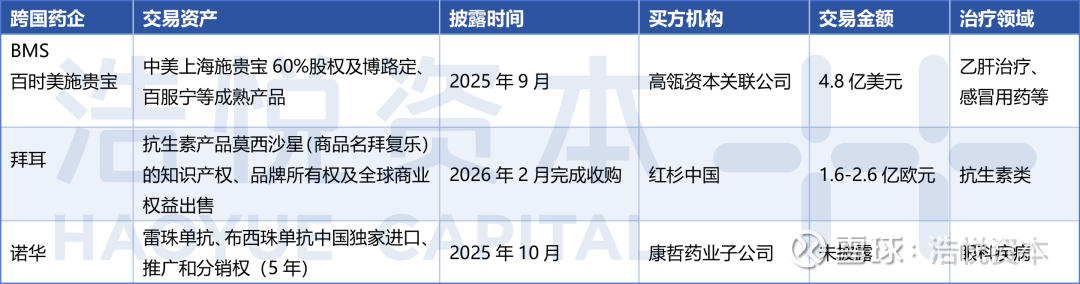 本年度,跨国药企在华战略调整持续深化,多家头部企业陆续剥离非核心业务或在华资产,呈现出”聚焦核心、出清非战略资产”的集中趋势。此类外资撤出并非单纯的市场撤离,而是全球资源重构与中国医药市场环境变化共同作用的结果,核心围绕成熟药品、非核心细分赛道展开,代表性案例包括BMS剥离在华合资业务、拜耳出让抗生素资产、诺华缩减眼科业务布局等。