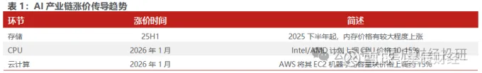 (1)2025Q4,AI产业链开启通胀传导,从存储到CPU后,云计算或为下一通胀方向。AI需求持续提升导致AI产业链自上而下出现不同环节依次涨价趋势,25H1开始存储率先开始涨价,26年1月CPU也开启涨价趋势,近期以AWS为代表的云计算厂商也开启涨价趋势。云计算厂商涨价或带来价值重估机遇,据维科网云计算观察微信公众号,AWS本次涨价标志着二十年来云服务价格只降不升的行业惯例被彻底打破,一旦云服务商在某一服务上成功提价而未引起大规模客户流失,第二次、第三次涨价就会变得更容易;AWS 发言人解释说:“EC2 机器学习容量块的定价基于供需模式而变化。此次价格调整反映了我们预期本季度的供需模式。”