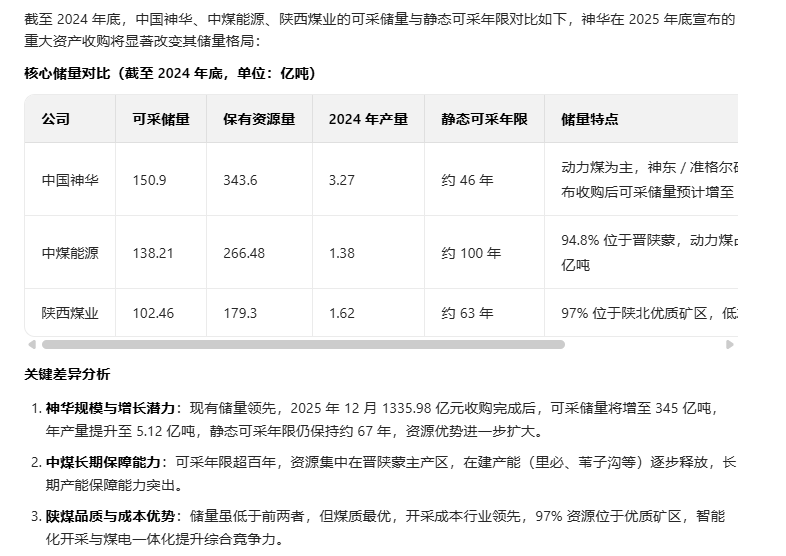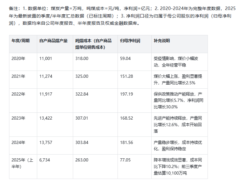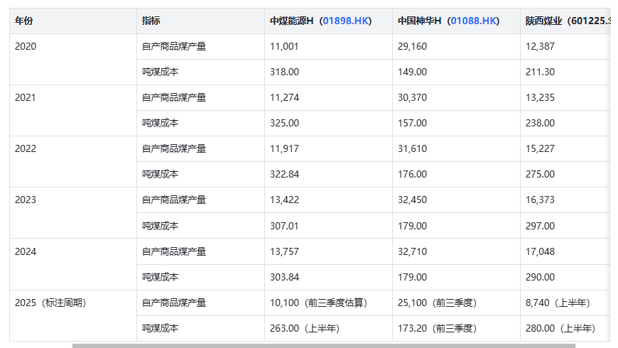 从AI生成的表可以看到中煤、神华、陕煤的产量都有所提升,神华的成本最低,但是相比2020年成本在上升,陕煤2020年成本比中煤低100元/吨,到2025年两者的成本一个升一个降,现在已经基本相当。
