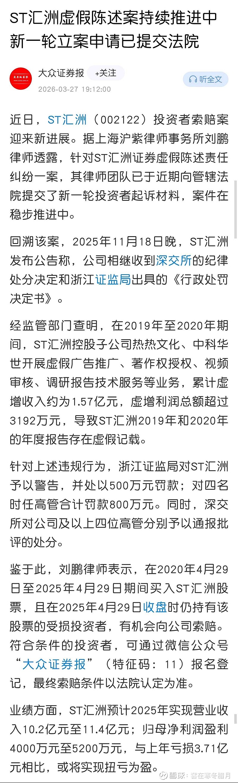 $ST汇洲(SZ002122)$