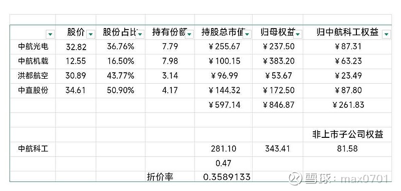 $中航科工(02357)$粗略按中报归母权益和股价估算下中航科工的折价率,按12月11日的股价,中航科工持有旗下4家a股公司的股票市值约597亿,4家A股子公司归科工的归母权益大约261亿。当前科工总市值281亿,归母权益343亿。除A股子公司外,科工剩下的子公司权益还有母公司账上的现金负债等总权益大约81亿。按归母权益的比例大致计算科工剩下的子公司权益还有母公司账上的现金负债等总价值大约是81/261*597。加上a股市值,科工旗下所有子公司加上母公司本身的现金负债总价值大约是783亿人民币。按当前281亿市值,281/783=35%左右,所以现在价值打3.5折左右。长期看安全边际个人感觉很高