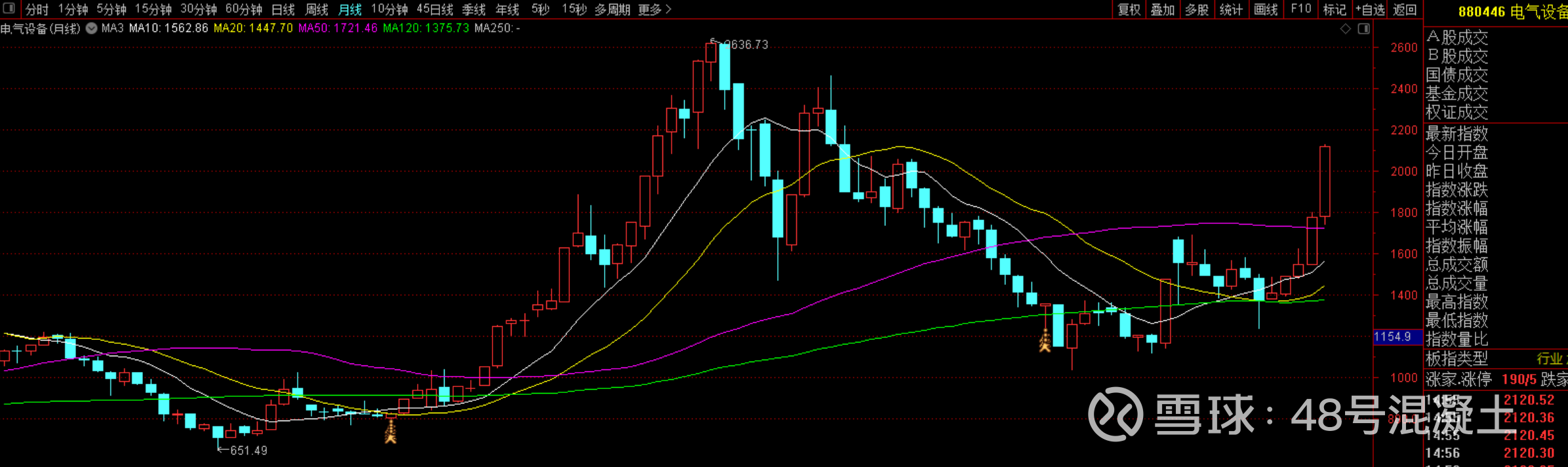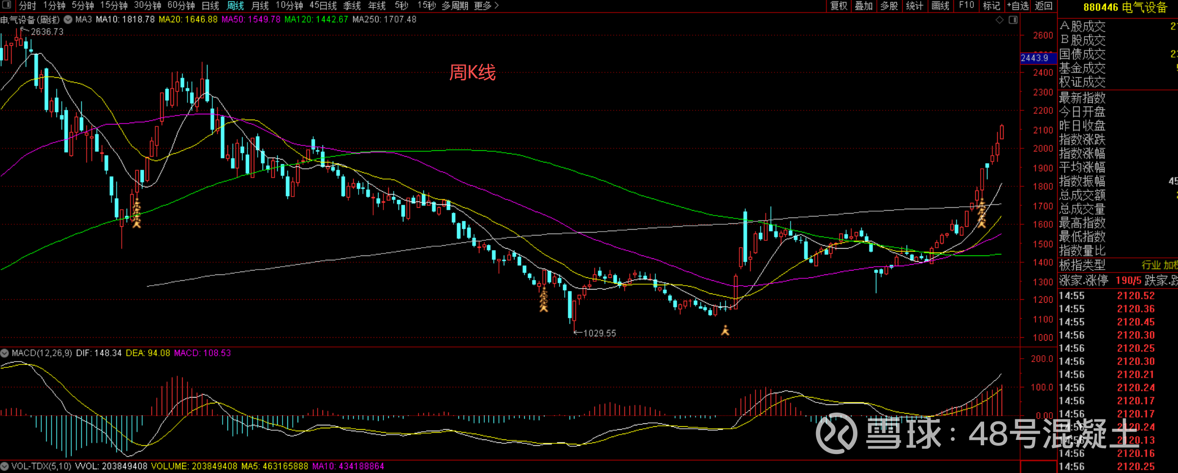 从电气设备的月K线看,本轮牛市还没有创出历史新高。周线看涨幅过大,警惕回调风险,没有买入的需要耐心等待。