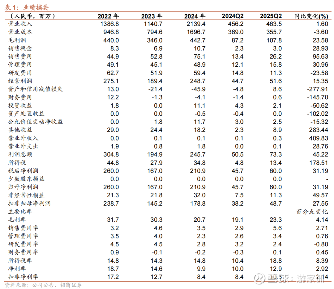 公司披露,2025 上半年公司分别实现收入、归母净利润、扣非净利润 8.88、1.10、0.95 亿元,同比增长 17.09%、48.83%、56.38%。其中 Q2 单季度,收入、归母净利润、扣非净利润 4.63、0.60、0.49 亿元,同比增长2%、31%、28%。