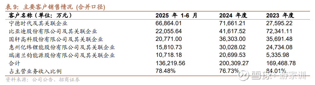 公司深度绑定下游头部电池厂商,主要客户包括宁德时代、比亚迪、国轩高科、亿纬锂能等。2025年上半年公司前五大客户营收占比78.48%,其中宁德时代及关联企业占比38.52%,是公司最大客户。