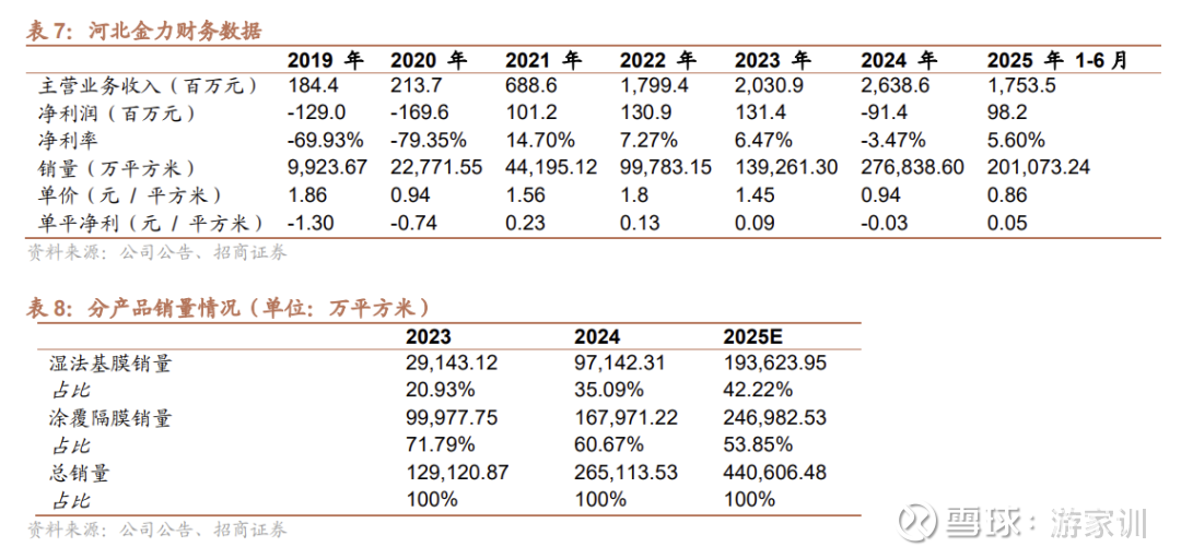 金力股份湿法隔膜规模居前,有望在5μm超薄高强膜领域实现赶超。金力股份是国内湿法隔膜主力参与者,2024年中国市占率18%(排名第二),全球市占率15.6%(排名第二)。公司聚焦发力超薄高强基膜,其 5μm 高穿刺强度产品 2024 年国内细分市场占有率 63%,目前占公司出货比例近4成。5μm产品技术壁垒高,有可能是未来技术路线的趋势,目前较7、9μm产品有2~3毛/平米溢价。公司25H1单平净利0.05元,考虑股份支付和财务费用差异,实际盈利水平已领先同行,伴随后续5μm隔膜渗透率提升,公司盈利优势可能进一步放大。