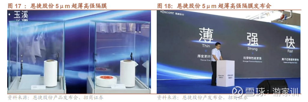 上市公司也纷纷布局,恩捷股份25年8月发布5μm超薄高强平台化产品针刺强度高达560gf,相较7µm隔膜,针刺强度提升16.7%,厚度减少28.5%(在针刺强度相同的情况下),同时隔膜内阻下降20.9%。