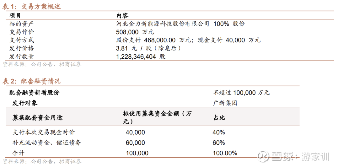 佛塑科技拟通过“发行股份+支付现金”的方式,收购金力股份100%股权,标的资产作价50.8亿元。其中,现金对价4.0亿元,股份对价46.8亿元,发行价格为3.81元/股(除息后)。同时,公司拟向控股股东广新集团发行股份募集配套资金不超过10亿元,用于支付本次交易的现金对价、补充流动资金及偿还债务。