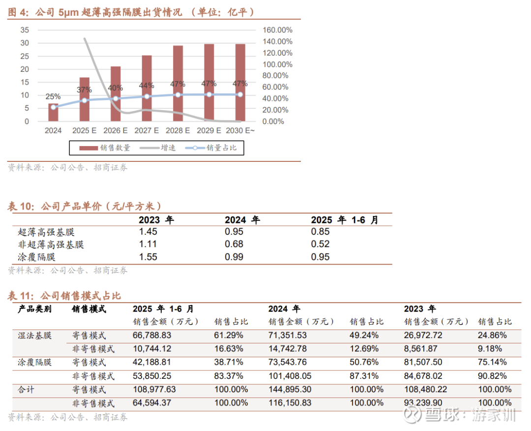 公司湿法基膜以寄售模式为主,涂覆隔膜以非寄售模式为主,主要系公司的超薄高强基膜在产品迭代中占据先发优势,近年来出货占比提升。2025 年上半年,公司超薄高强基膜销量为 7.69 亿平方米,占出货比例提升至 38.26%,已超过 2024 年全年销量 6.88 亿平方米,预计后续占比将持续提升。