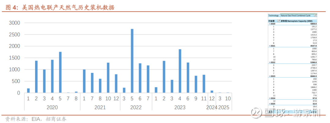 未来几年美国燃气发电并网项目有望大幅增加。根据EIA数据,2020–2023年美国热电联产燃气轮机年新增并网量保持在4–7GW,这主要得益于特朗普上任期间规划的天然气项目陆续完工。2024–2025年预计年新增并网不足100MW,与拜登政府推动清洁能源的政策有关。当前特朗普政府正再度推动天然气项目,预计2028–2029年将迎来并网高峰,2028年当年并网量有望超过10GW。