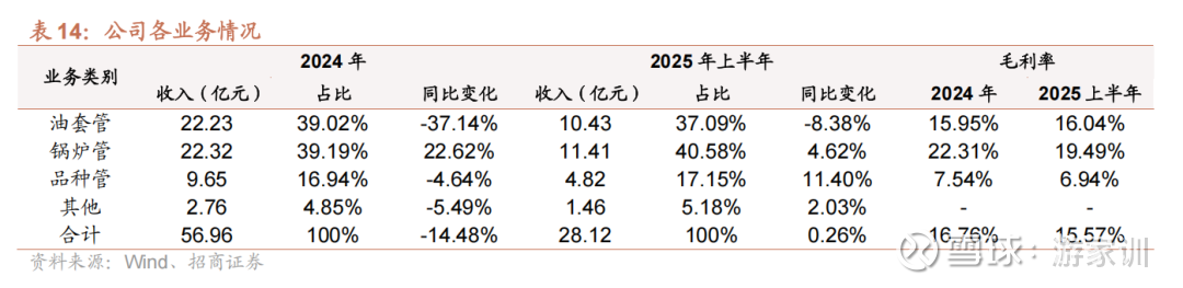 1)油套管业务:收入占比最高,但受油气需求波动和贸易壁垒影响,下降明显。2024年全年收入占比39.02%,同比下降37.14%;2025年上半年占比37.09%,同比下降8.38%。毛利率稳定微升,2025上半年16.04%,同比+0.84pcts。