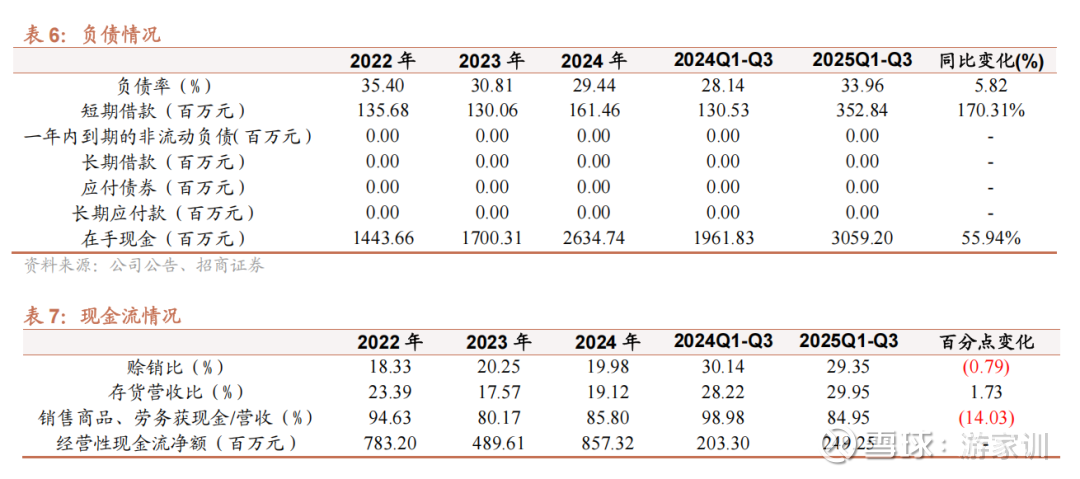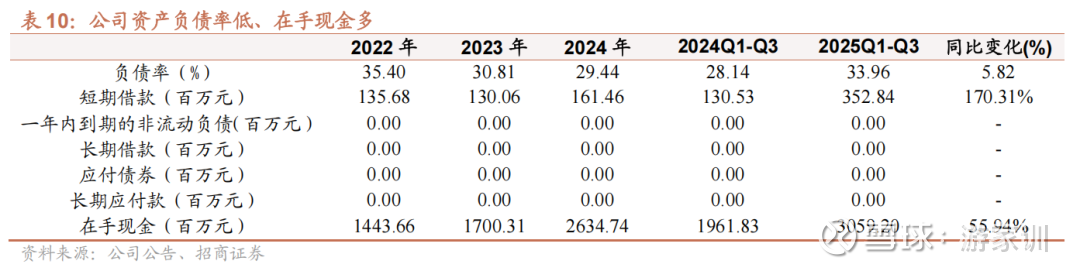 公司资产负债率低,在手现金多,运营相对安全。整体看,公司整体资产负债率34.0%,资产负债率低。在手现金30.6亿元,短期借款为3.5亿元,整体现金流较为充沛。