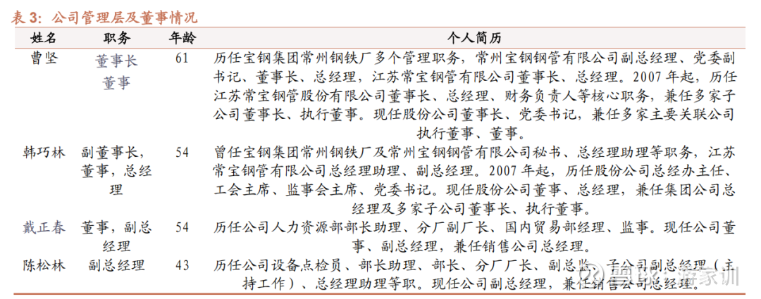 公司当前管理层为常宝有限老班子成员。董事长曹总,历任宝钢集团常州钢铁厂设备科和热轧车间管理人员、企管办副主任、财务科副科长、营销部经理,改制后拿到公司股权,并一直持续至今担任公司董事长。副董事长韩总,曾任宝钢集团常州钢铁厂三改办秘书、党办秘书,目前是公司副董事长、总经理,三季度直接持股1.23%。其余公司高管,戴正春、刘志峰、陈松林、丁伟等也均为长期在公司担任要职,成长起来的高管。
