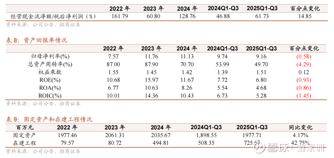 现金流强劲,在手现金超30亿。公司经营现金流持续改善,前三季度经营现金流净额达2.49亿元,同比增长22.60%,其中Q3现金流入显著,带动经营现金流/净利润比率提升至61.73%。且公司Q3期末货币资金为30.59亿元,同比增长15.94%,流动资金充裕。尽管短期借款有所增加,但公司持续投入在建工程(同比增长46.66%至7.26亿元),为未来产能扩张奠定基础。