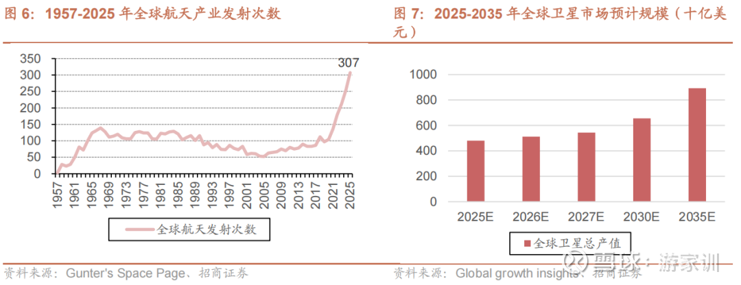 全球航天产业加速爆发,商业化浪潮势不可挡。当前,全球航天产业已步入规模化发展快车道。2024年全球产值达4150亿美元,在轨航天器总量猛增至1.16万颗。竞争格局方面,美国凭借75.9%的份额稳居榜首,中国则以9.4%的份额跃升至世界第二,通信卫星成为在轨主流(占比超74%)。值得注意的是,以盈利为导向的“商业航天”已成为绝对增长引擎,占据了全行业70%以上的份额,并推动2025年全球发射次数创下307次的历史新高。展望未来,Global Growth Insights 预测全球卫星及商业航天市场将保持年均6%以上的复合增长,预计2035年市场规模有望冲击9000亿美元大关,发展空间极为广阔。
