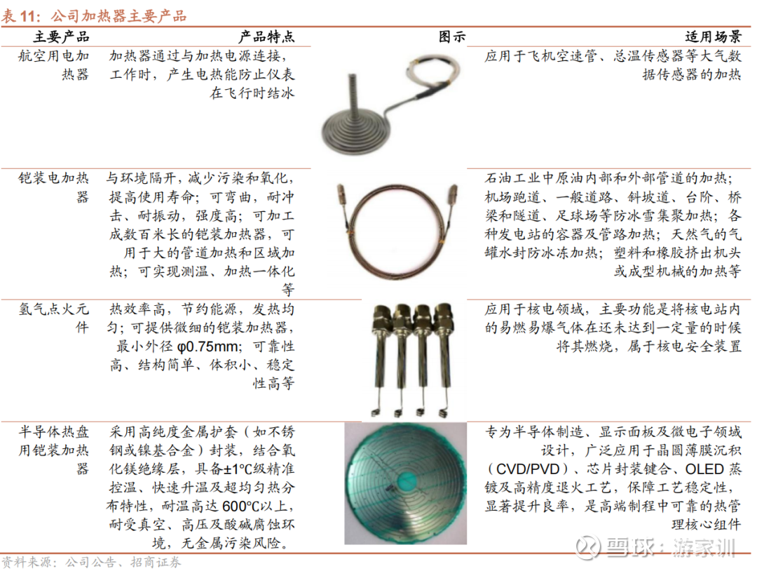 公司主要为新能源(燃料电池、光伏)、工业设备(电力、化工、汽 车、半导体)、航空航天和核电等领域提供温度传感器、电加热器、铠装电缆等产品。其中以温度传感器、电加热器、铠装电缆为主。