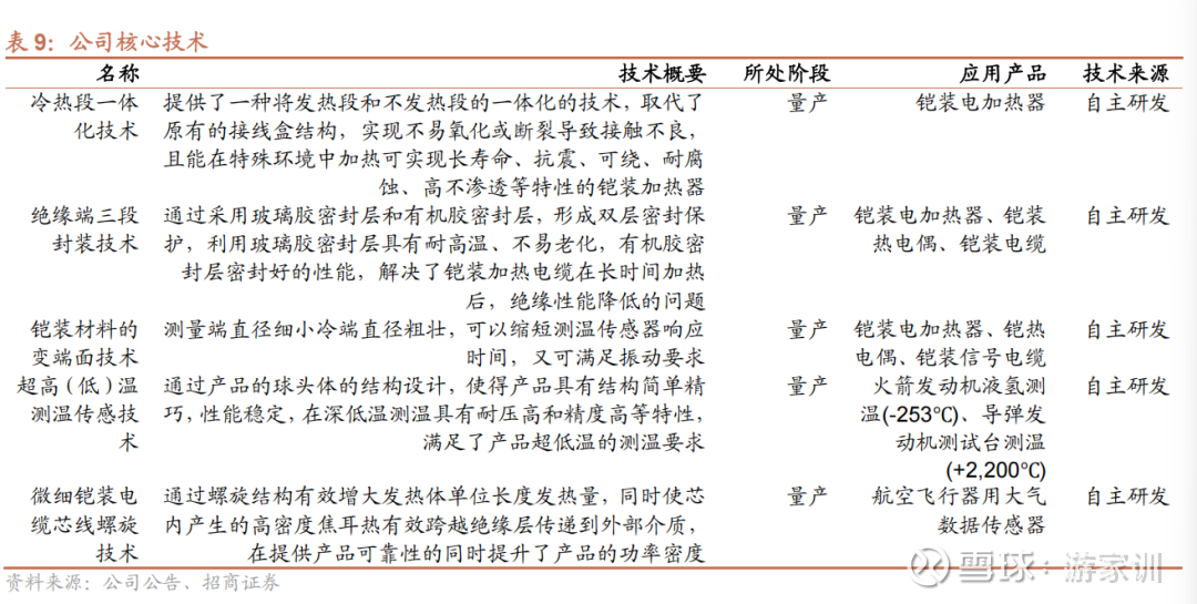 公司竞争力领先,目前授权专利 37 项,其中发明专利 8 项,实用新型专利 29 项。公司核心技术基本为自主研发,占营收 97%以上。其中,公司使用核心技术 “冷热段一体化技术”和“芯线螺旋技术”打造航空航天领域用电加热器,尺寸更小、 故障点更少,在耐压性能、绕制性能等指标方面大幅优于行业标准。