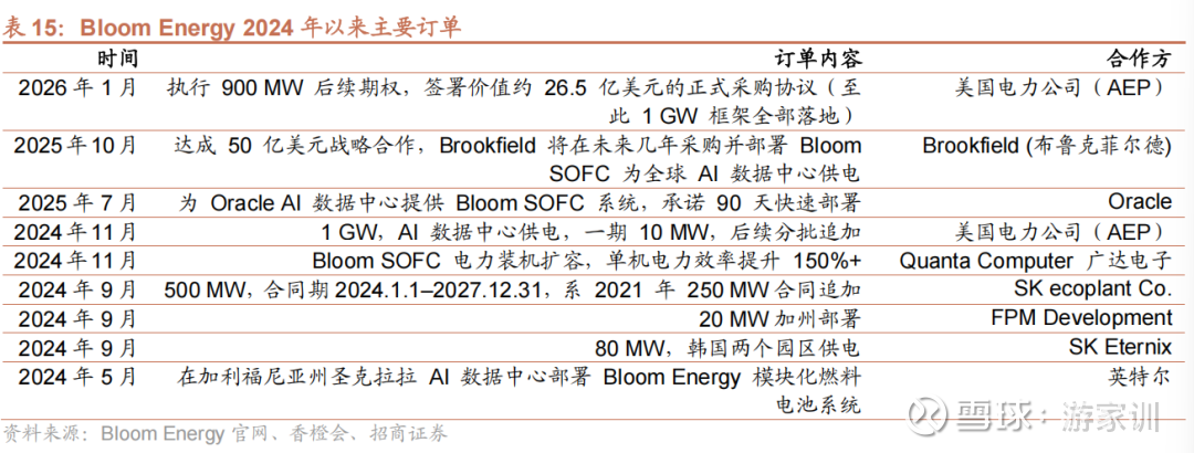 龙头公司BE产能订单快速增加,SOFC迈入大规模商业化拐点。2026年1月,美国电力公司(AEP)宣布行使期权,向Bloom Energy购买高达 1GW(100MW初始+900MW期权) 的固体氧化物燃料电池(SOFC),是继25Q3 BE与Brookfield达成50亿美元战略合作后的又一标志性事件。目前BE累积订单近2GW,新增订单主要用于数据中心供电,这标志着SOFC在数据中心场景的应用已从“验证期”正式迈入“大规模放量期”。