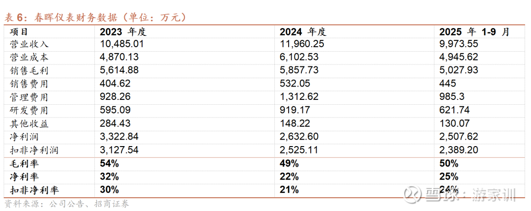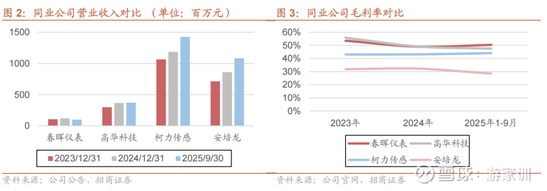 2024年受研发投入加大、股份支付费用及管理费用上升等因素影响,春晖仪表净利润为2,632.60万元,较2023年有所下滑。2025年前三季度,公司实现净利润2,507.62万元,盈利能力显著回升。相较于同行业公司,由于公司主要客户为海外燃料电池以及国内军工类客户,技术和质量要求更高,所以利润率领先。其中,核心产品(供BE外销温度传感器)毛利率高达57.40%,远超行业平均水平。