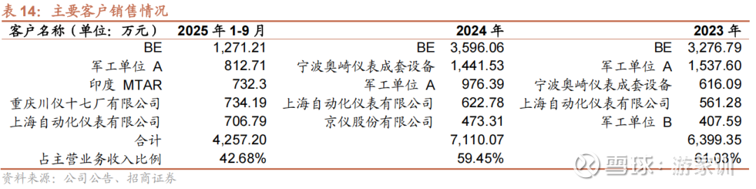2025年1-9月公司前五大客户营收占比42.68%,主要客户包括BE、军工企业、上海自动化仪表有限公司等。公司深度绑定BE,2023-2025年1-9月BE(含直销及通过MTAR、高力的间接供货)合计销售占比约30%。2025年前三季度因美国关税影响发货暂缓,收入略降;但截至9月末在手订单充裕(约3,200万元将在年底交付),预计2025全年销售额不低于2024年水平。