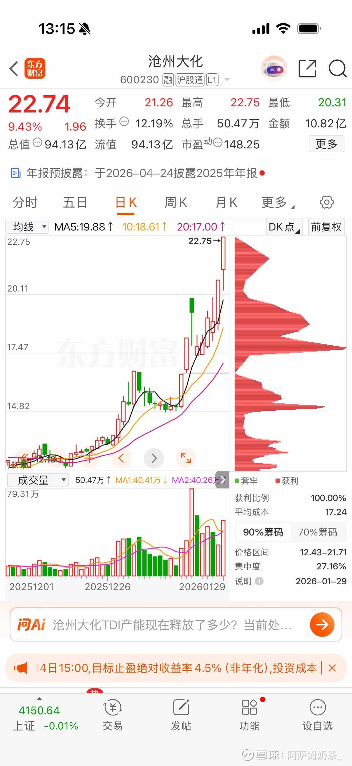 $沧州大化(SH600230)$ 这又涨停了,要走成龙头了$万华化学(SH600309)$ 万华化学今天可能是最好的上车机会,这票是大票,走得慢,喜欢震荡。(老登最爱)化工今年是绝对大年,万华化学年内目标先看50%-100%,预计持仓至年底,长线单。