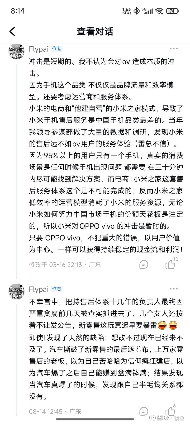 $小米集团-W(01810)$ 这几个月小米手机销量被OV反超总有点想不明白,小米之家增加了那么多,品牌流量靠着小米汽车的出圈也是OV无法企及的,看了前小米人@Flypai 的对小米的一些点评,原来小米的售后服务真的很差,原来小米之家新零售很多都是靠汽车合作的信仰支撑,感觉小米非汽车部门真的存在很大问题,当然产品增长能解决一切问题,就看小米16的市场反馈了,要是没啥起色,我感觉小米之家这种目前靠信仰支撑的新零售迟早会暴雷。发布会后看情况可能会卖一半小米持仓了。