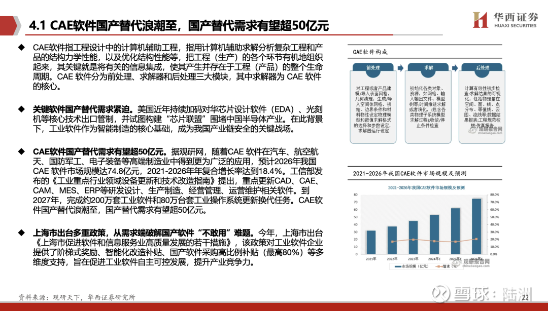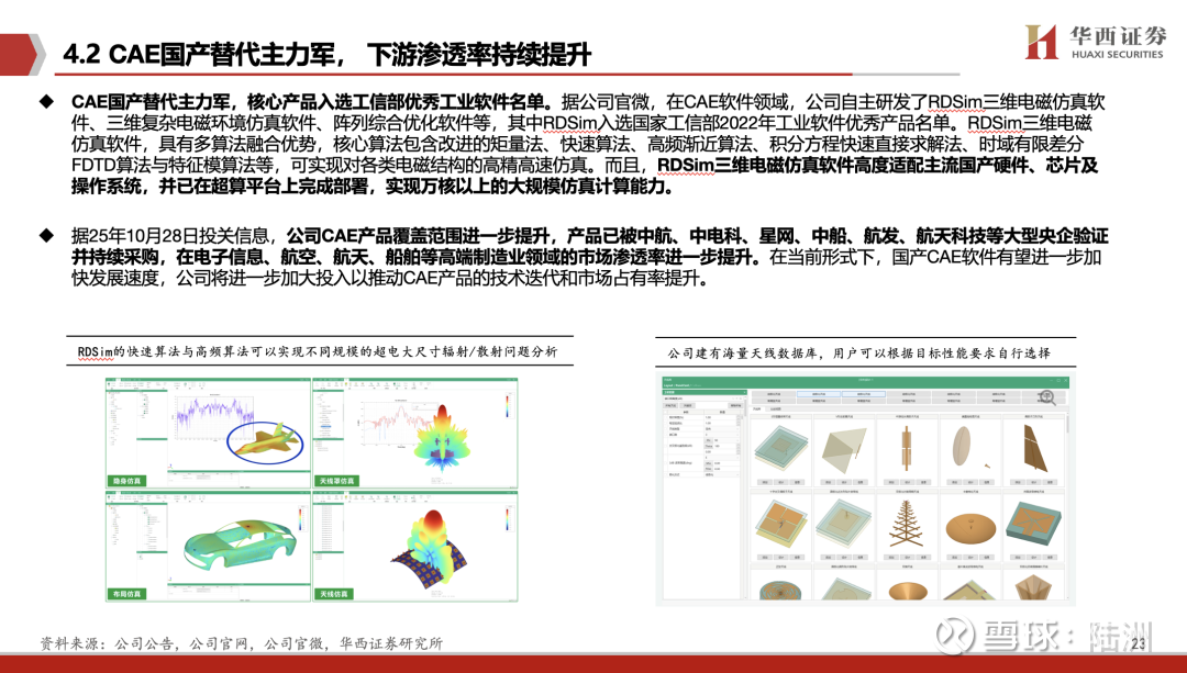 关键软件国产替代需求紧迫。美国近年持续加码对华芯片设计软件(EDA)、光刻机等核心技术出口管制,并试图构建“芯片联盟”围堵中国半导体产业。在此背景下,工业软件作为智能制造的核心基础,成为我国产业链安全的关键战场。据观研网,CAE软件国产替代需求有望超50亿元。公司作为CAE国产替代主力军,核心产品入选工信部优秀工业软件名单。公司RDSim三维电磁仿真软件高度适配主流国产硬件、芯片及操作系统,并已在超算平台上完成部署,实现万核以上的大规模仿真计算能力。同时,公司积极研发AI+CAE,赋能物理AI发展。11月24日,公司低空物理AI产品亮相,该体系打通全流程数字化仿真与设计评估关键环节,可精准匹配智能布站、动态路径规划、航道监测等低空管控核心需求,有效实现区域低空管控精准度与运营效率的双重提升,提供技术赋能。