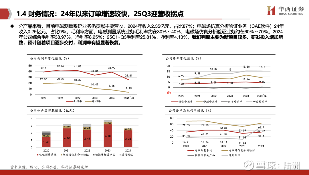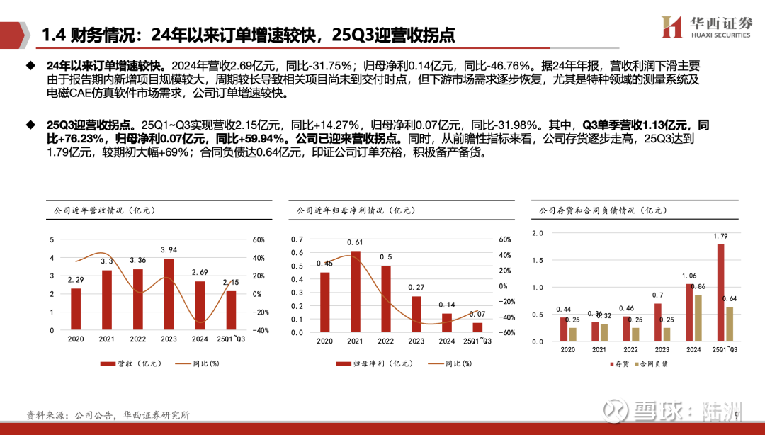 24年以来订单增速较快,25Q3迎营收拐点。2024年营收2.69亿元,同比-31.75%;归母净利0.14亿元,同比-46.76%。但下游市场需求逐步恢复,尤其是特种领域的测量系统及电磁CAE仿真软件市场需求,公司订单增速较快。25Q1~Q3实现营收2.15亿元,同比+14.27%,归母净利0.07亿元,同比-31.98%。其中,Q3单季营收1.13亿元,同比+76.23%,归母净利0.07亿元,同比+59.94%。公司已迎来营收拐点。同时,存货及合同负债高增,印证公司订单充裕,积极备产备货。
