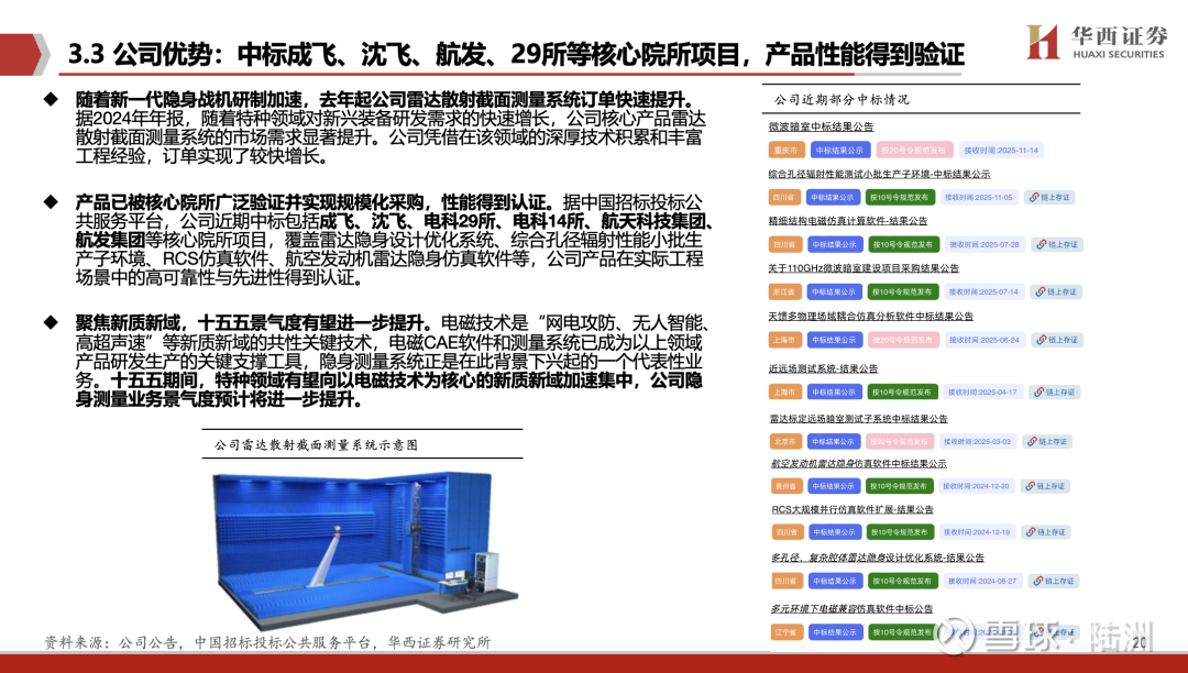 雷达散射截面积测量是设计、制造、维护隐身飞机的必要手段,贯穿全生命周期。第五代战斗机均为具有隐身功能的新一代战机,催生大量隐身测量需求。此外,当前隐身测量需求的释放主要集中在战机的研发阶段。随着新一代战机持续批量列装,相关需求将逐步向生产端转移,而生产阶段的测量需求规模预计更为庞大。同时,隐身无人机测量潜在市场广阔。据中国招标投标公共服务平台,公司近期中标包括成飞、沈飞、电科29所、电科14所、航天科技集团、航发集团等核心院所项目,覆盖雷达隐身设计优化系统、综合孔径辐射性能小批生产子环境、RCS仿真软件、航空发动机雷达隐身仿真软件等,公司产品在实际工程场景中的高可靠性与先进性得到认证。
