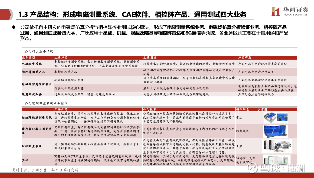 国内领先的电磁仿真与测量系统厂商,技术达国际先进水平。公司依托自主研发的算法技术体系,根据下游行业的发展需求,构建了电磁场仿真分析验证、电磁测量系统、相控阵产品三大业务板块,主要服务于特种、卫星、通信、汽车等高端制造业的产品研发、生产及应用。公司是业内极少数同时掌握电磁仿真设计和校准测量两类算法技术的企业。